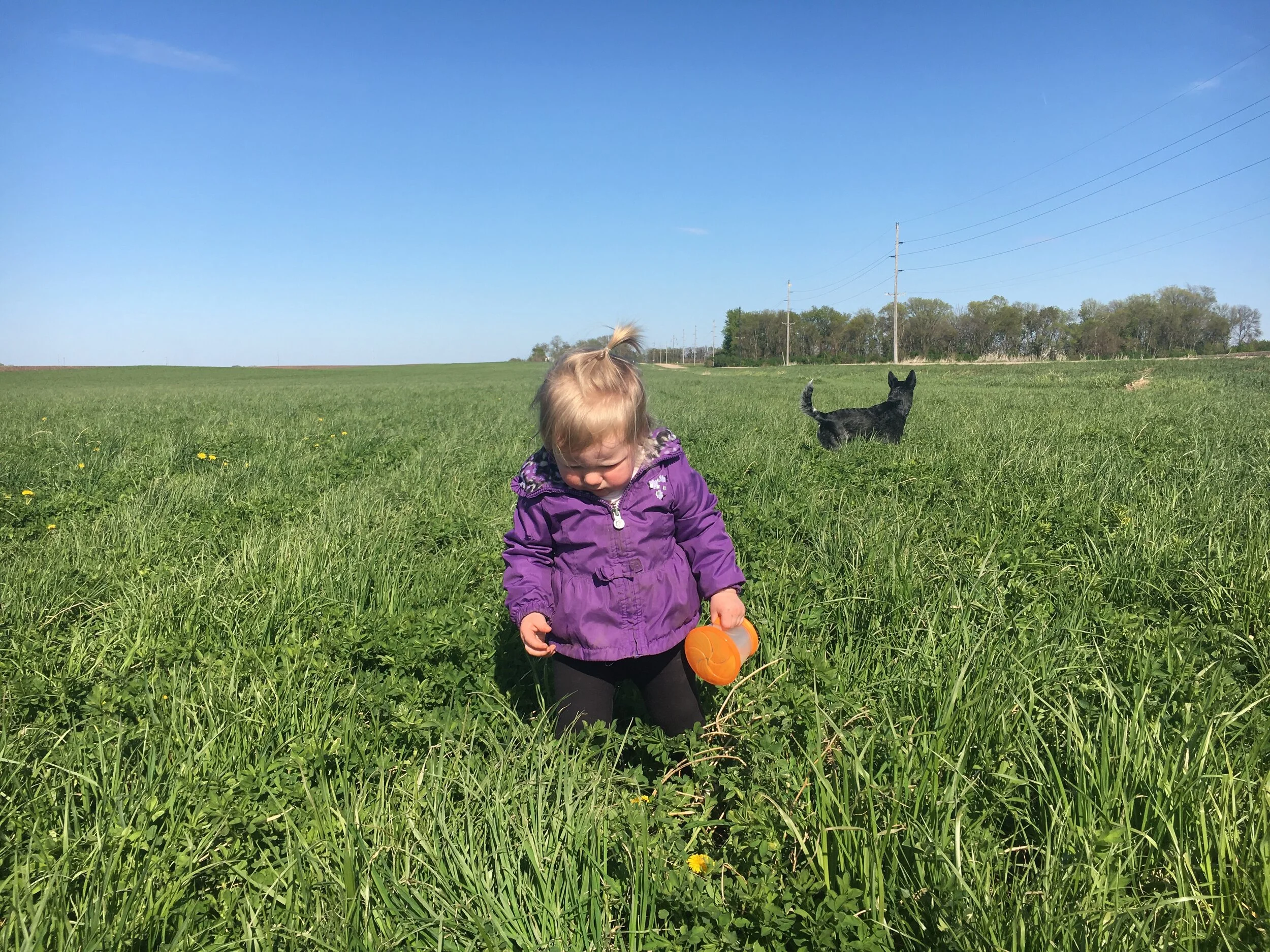 Tonight Miss M., Willow and I took a walk down our gravel road, making a pit stop at our alfalfa grass field. From the road it seems like a slow start to the spring growth of our first crop of hay.